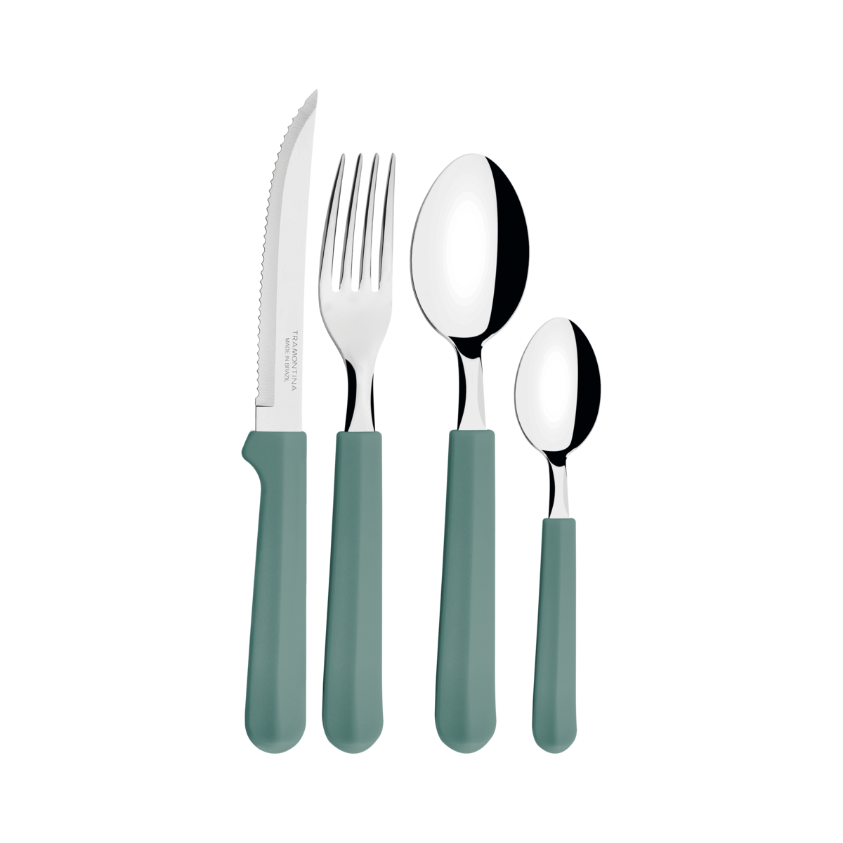 O faqueiro Tramontina Tulum com lâminas em aço inox e cabos de polipropileno preto 24 peças é um coringa para a composição da sua mesa e irá compor bem com qualquer estilo de louça. Todas as peças são desenvolvidas com lâminas em aço inox com cabos de polipropileno. As facas tem tratamento térmico e garantem alta durabilidade no fio de corte e os garfos e colheres contam com estampagem e espessura, fazendo que sejam resistentes e duráveis. Os cabos são em polipropileno na cor menta, garantem modernidade para sua mesa e podem ir à máquina de lavar louças, facilitando seu dia a dia na cozinha!