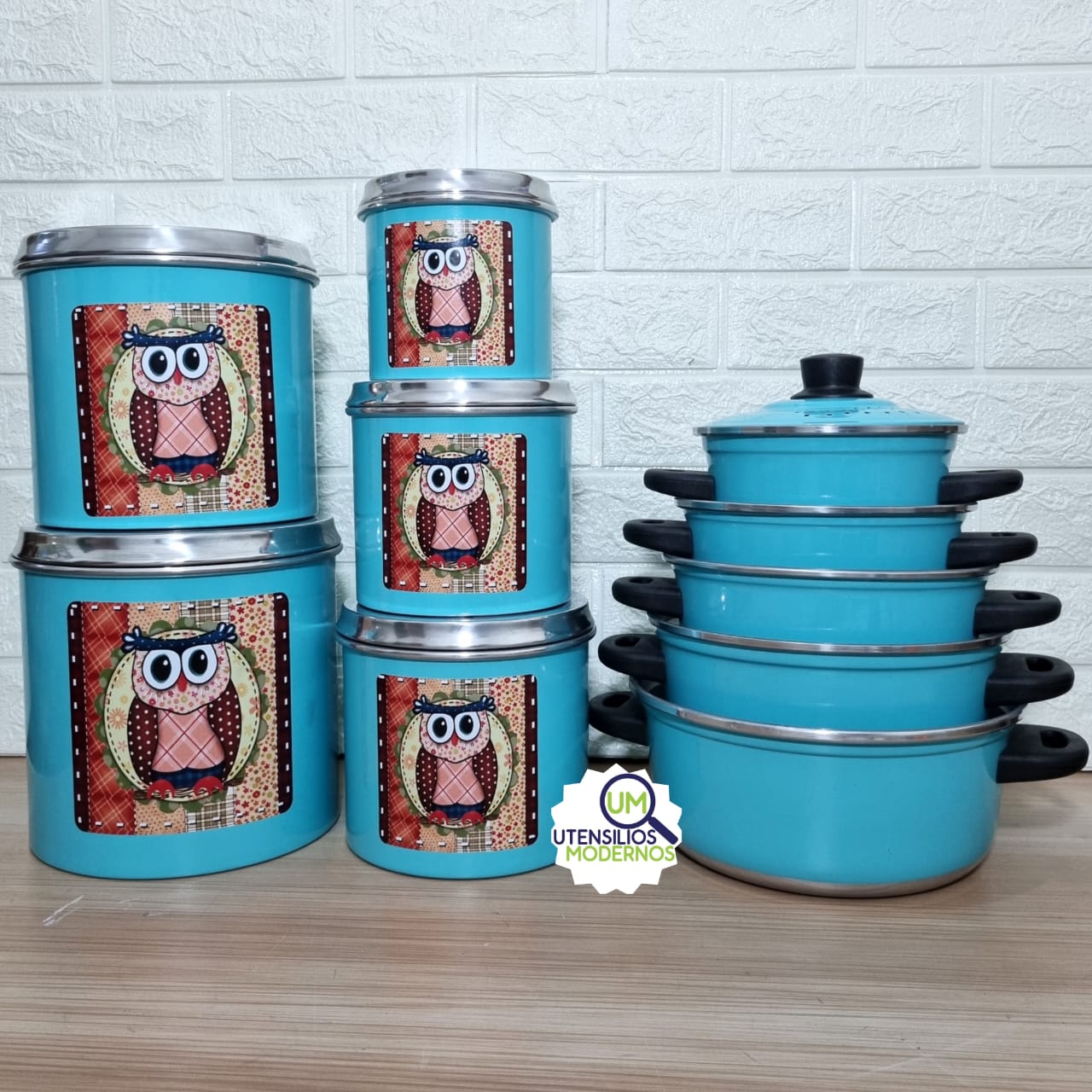 Jogo de Panela 5 Pçs Tiffany + Kit Mantimentos Alumínio 5 Pçs Coruja Tiffany + Espátulas