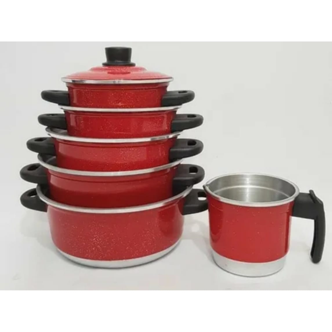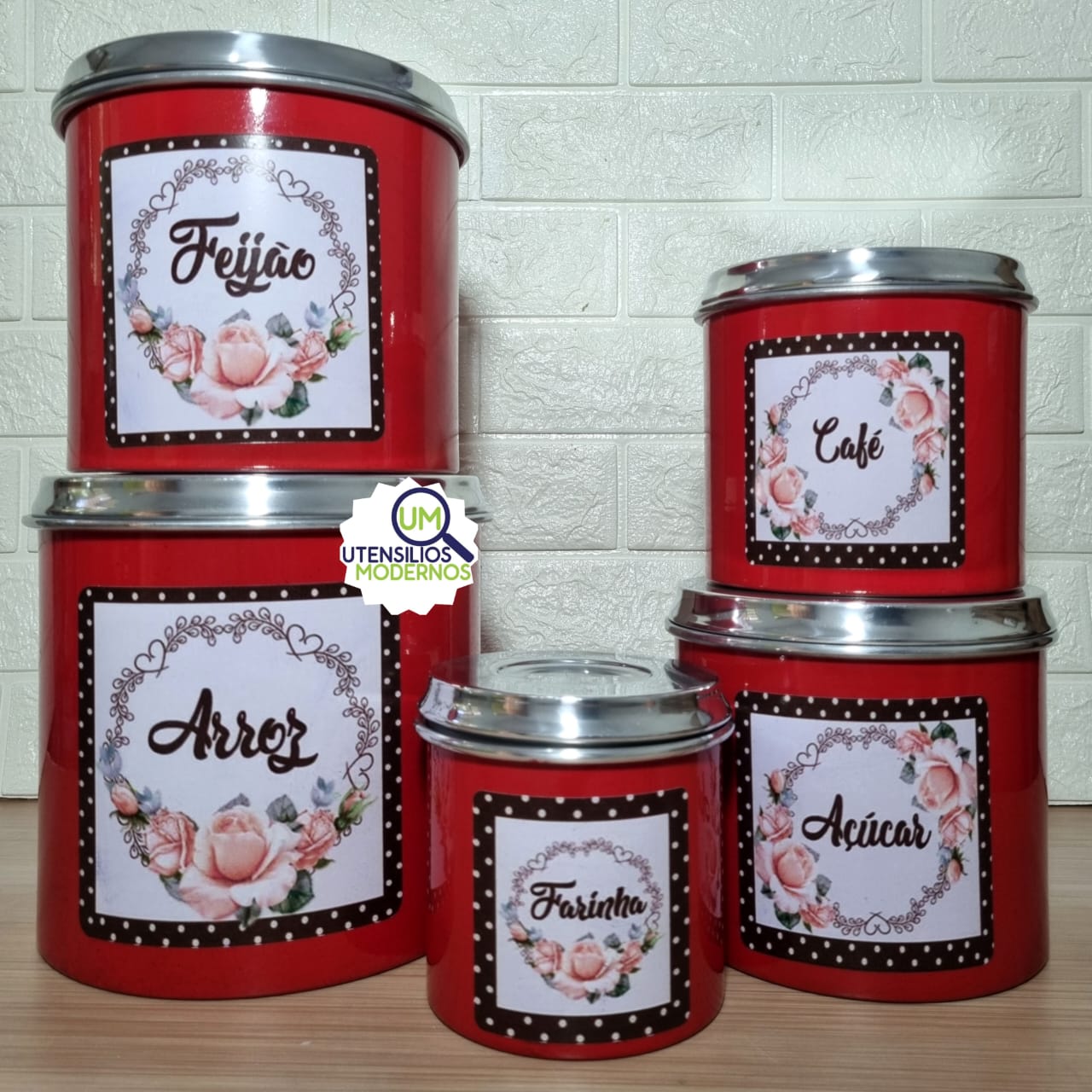 Jogo de Panela 5 Pçs Vermelho + Ferv + Kit Mantimentos Alumínio 5 Pçs Flor 1 Vermelho