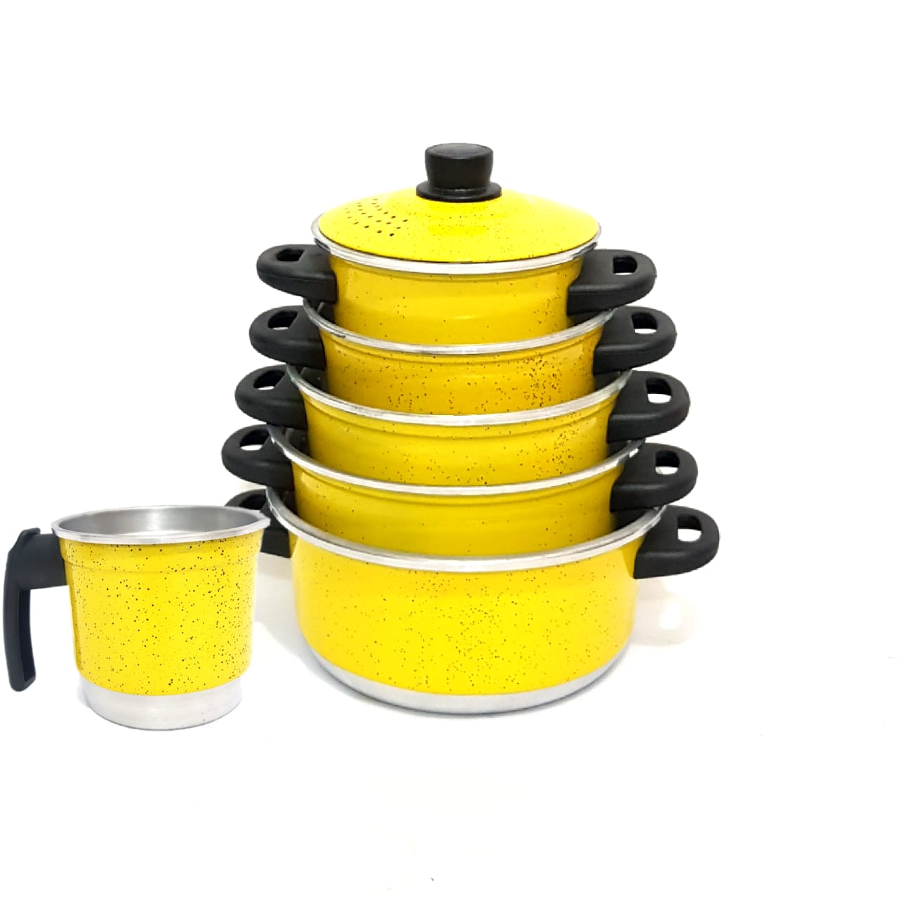 Jogo de Panela 5 Pçs Amarelo + Ferv + Kit Mantimentos Alumínio 5 Pçs Flor 4 Amarelo + Espátulas