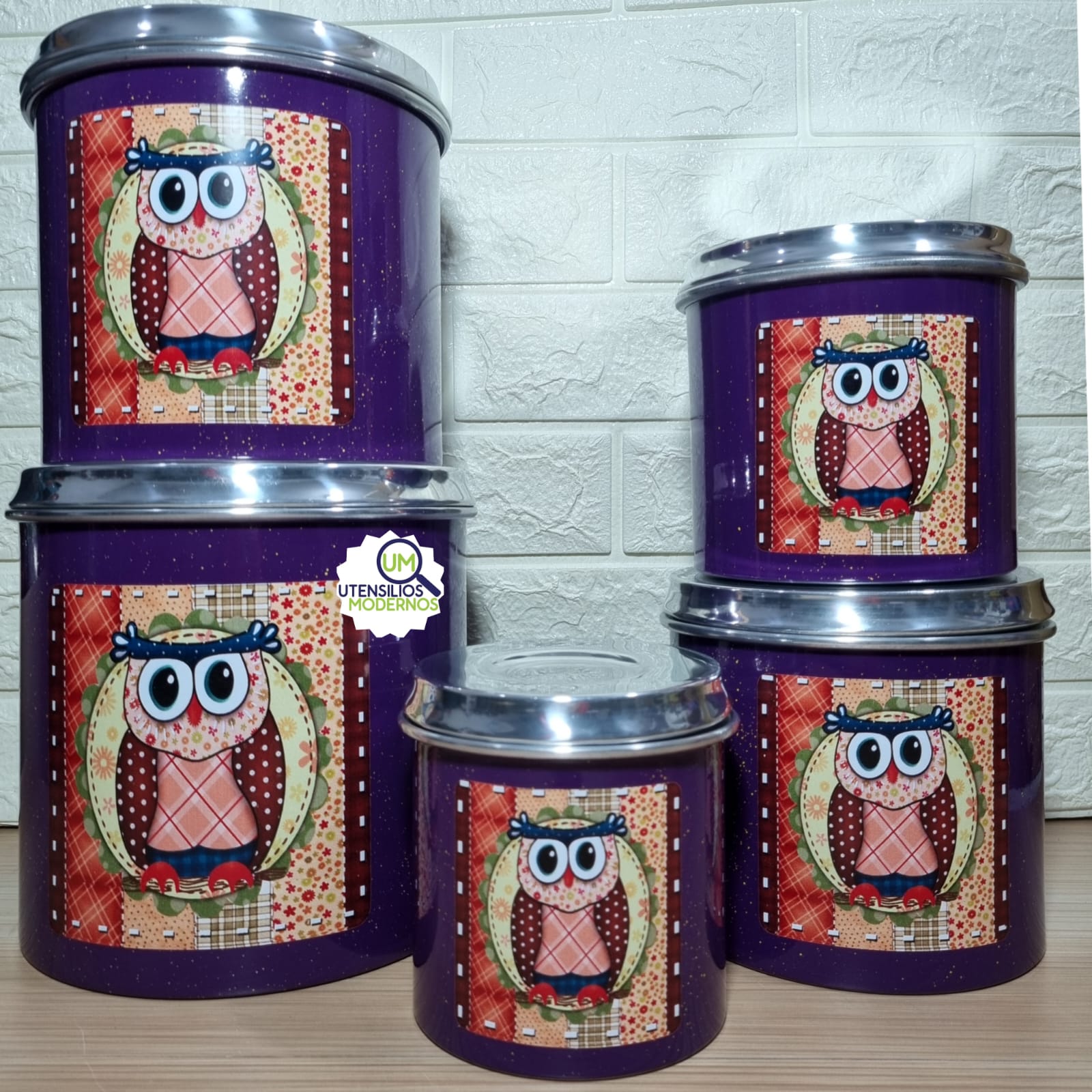 Jogo de Panela 5 Pçs Roxo + Kit Mantimentos Alumínio 5 Pçs Coruja Roxo + Espátulas