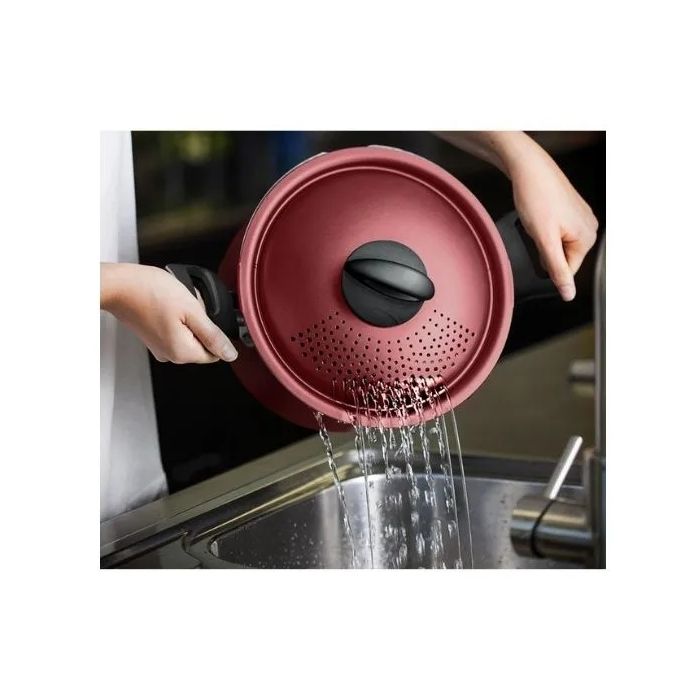 A trava de segurança da tampa permite mantê-la fixa junto a panela, facilitando escorrer os alimentos.
